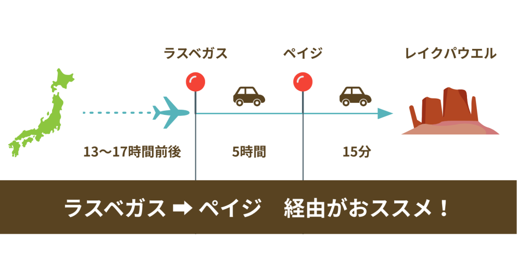 日本からレイクパウエルに行く場合、最も一般的で便利なのが「ラスベガス経由」のルートです。